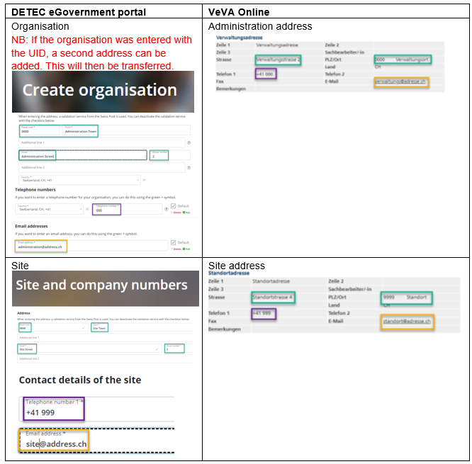 The organisation address on the eGovernment portal corresponds to the administration address in veva-online.