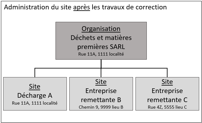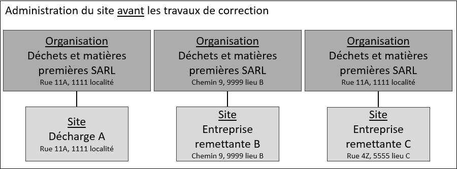 Les travaux en cours visent à regrouper les sites existants et valides dans l’organisation correspondante. Une organisation peut avoir une adresse administrative et plusieurs sites. Chaque site peut avoir une adresse individuelle et différente de celle de l’organisation.