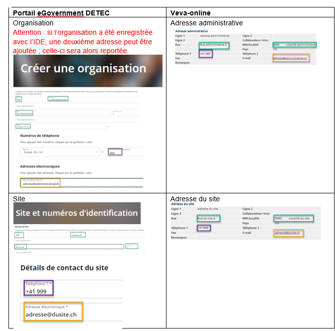 L’adresse de l’organisation enregistrée dans le portail eGovernment correspond à l’adresse administrative saisie dans la plate-forme veva-online.
