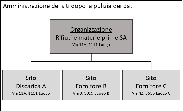 Se si accorge che un sito è stato assegnato all’organizzazione sbagliata, potrà correggere il dato direttamente Lei. A tale scopo è disponibile il servizio Assegnare siti a un’organizzazione. Per poter apportare una modifica è necessario disporre dei diritti anche per la nuova organizzazione.