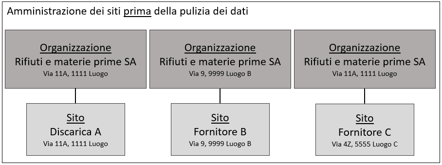 I lavori in corso mirano a riunire sotto l’organizzazione corrispondente i siti già registrati e validi. Una stessa organizzazione può infatti avere un solo indirizzo amministrativo ma più siti. Ogni sito può avere un proprio indirizzo diverso da quello dell’organizzazione.